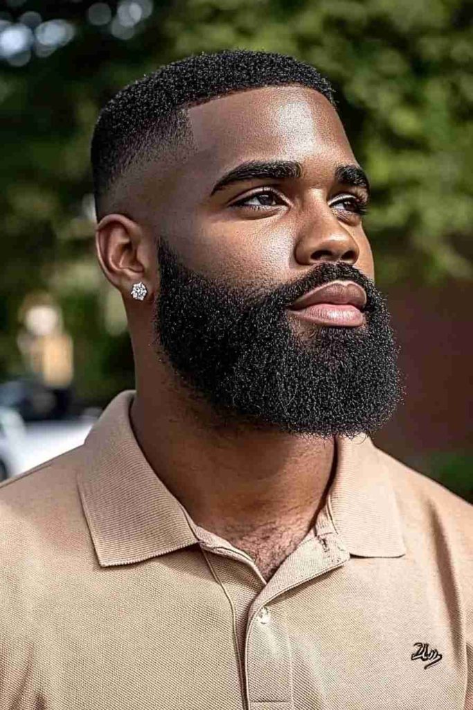 The fade near the sideburn area helps the beard sit better on the face. For beard styles for Black men that balance fullness and structure, this one fits perfectly.