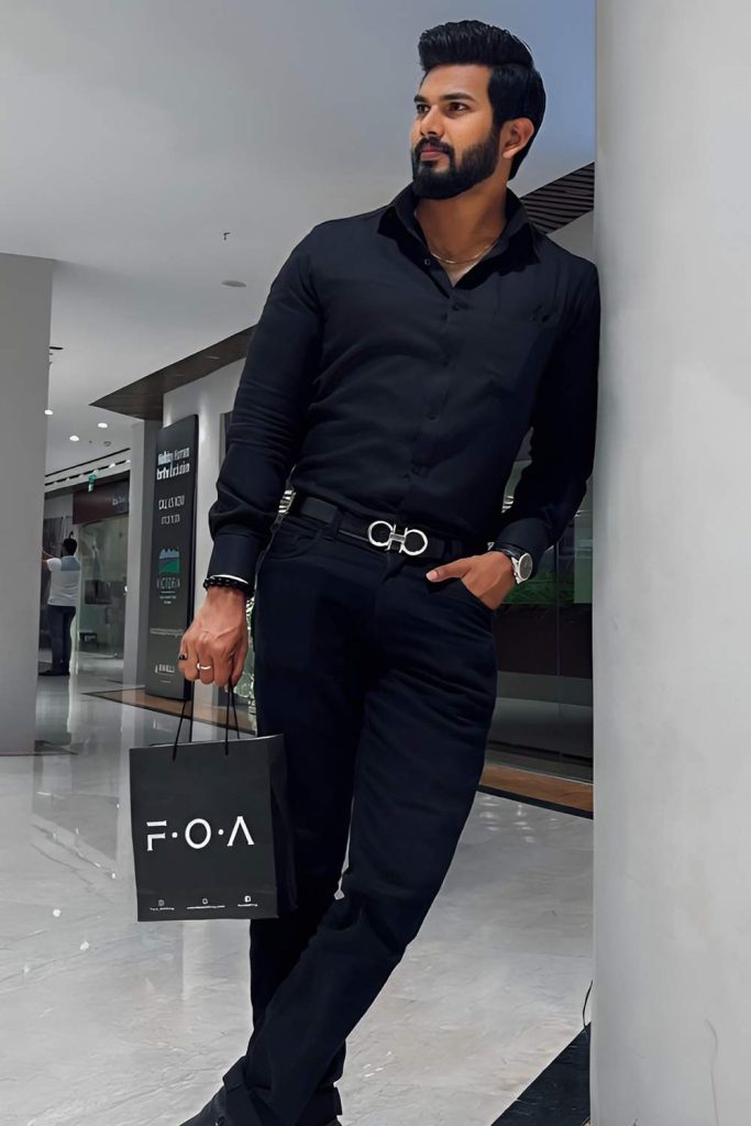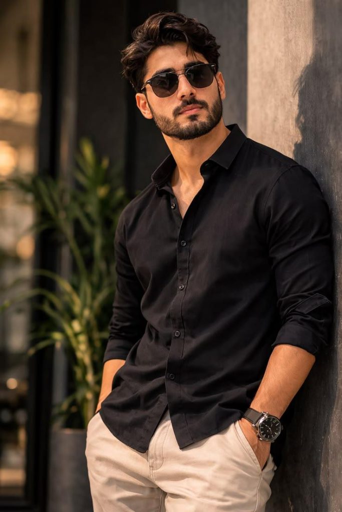 An all-black outfit looks confident and modern when the fit is right. Pair a black shirt with black jeans or tailored black trousers for a sleek, simple outfit that always feels intentional.