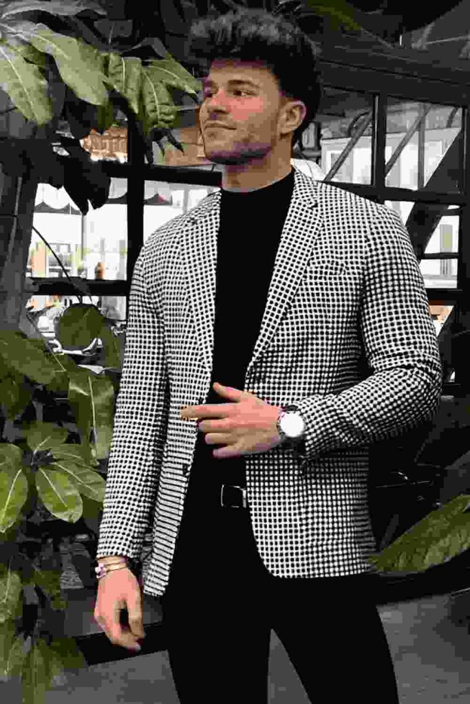 A patterned blazer instantly upgrades a black shirt. Checks, subtle plaids, or textured fabric add interest while the black base keeps the outfit grounded and sleek.