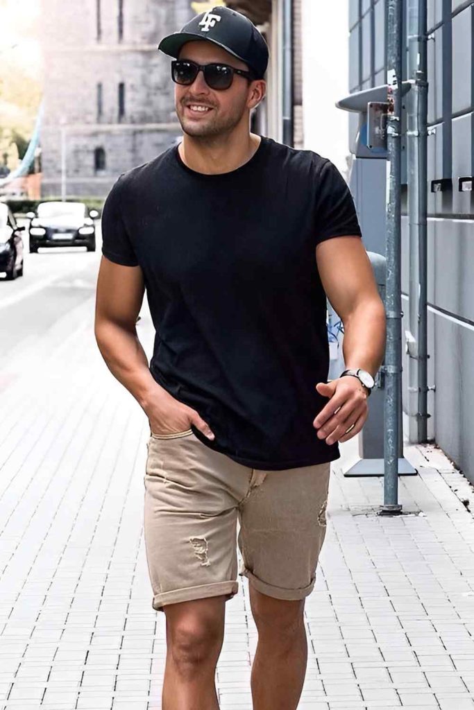 A black shirt with khaki shorts is a smart way to dress in warm weather. The shorts keep it casual, while the black shirt makes it look more structured than a regular tee.