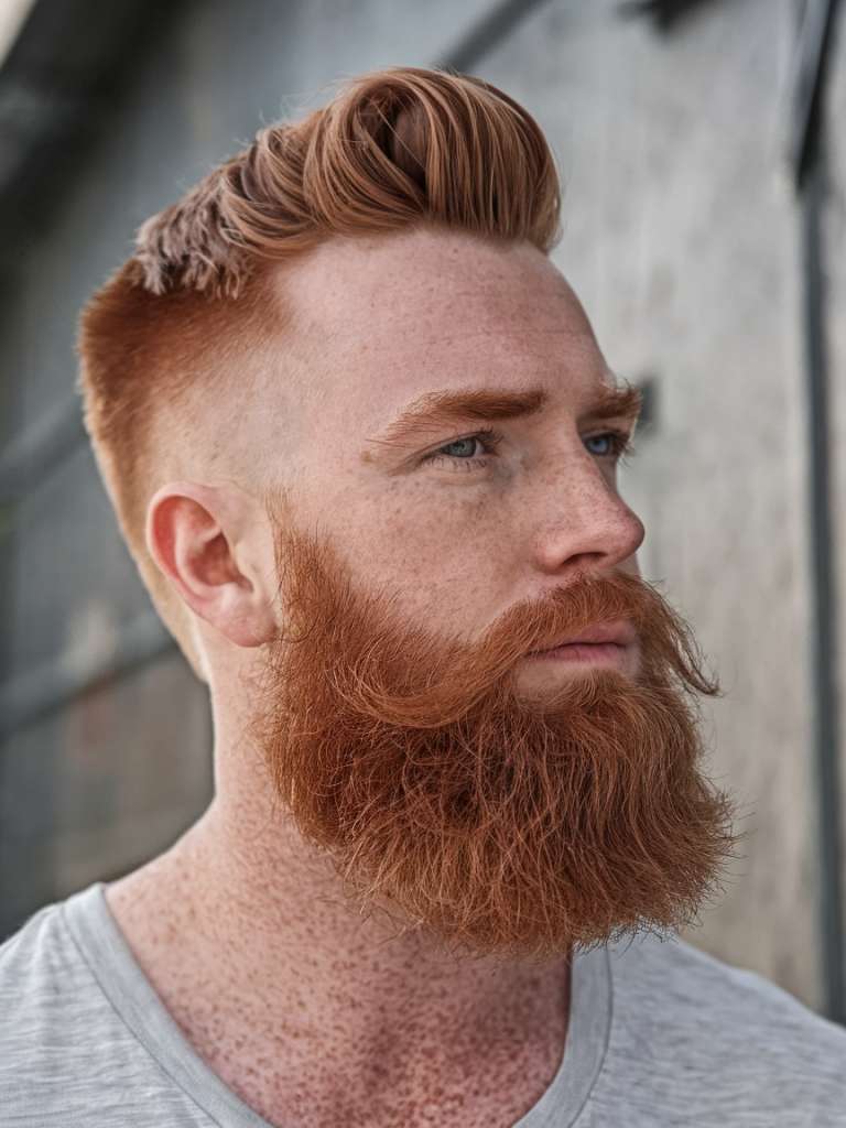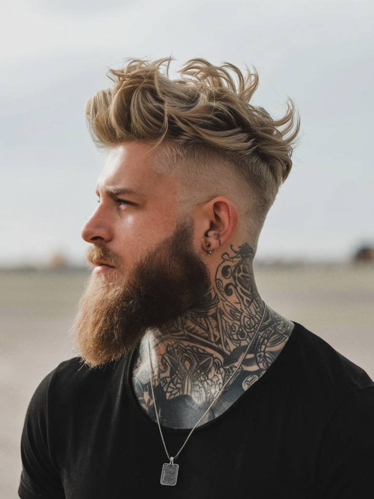 This look combines a messy blonde mohawk with a thick beard. The result is rugged, masculine, and stylish at the same time.