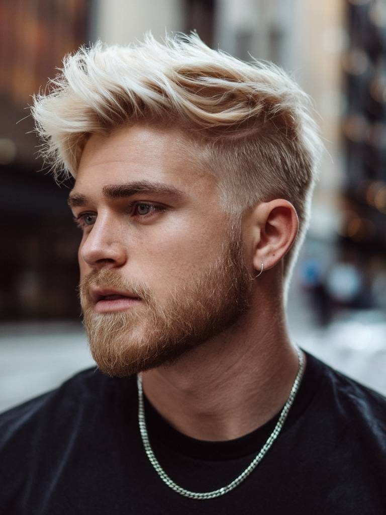 This haircut stands out because of its bright platinum color and short faded sides. It looks modern, clean, and very bold.
