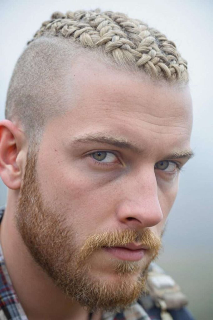 This hairstyle features blonde braided rows on top with shaved sides for a rugged but stylish result. It has a strong look that feels masculine and modern at the same time.