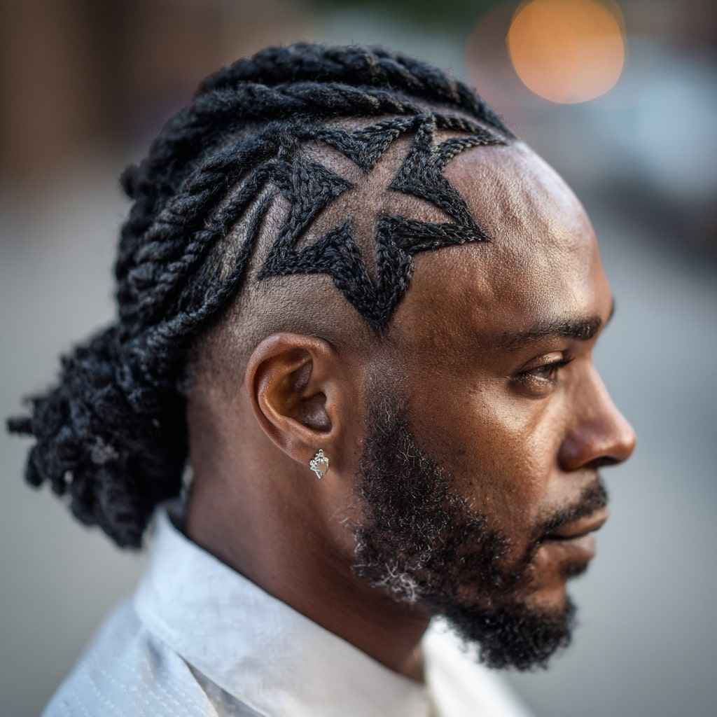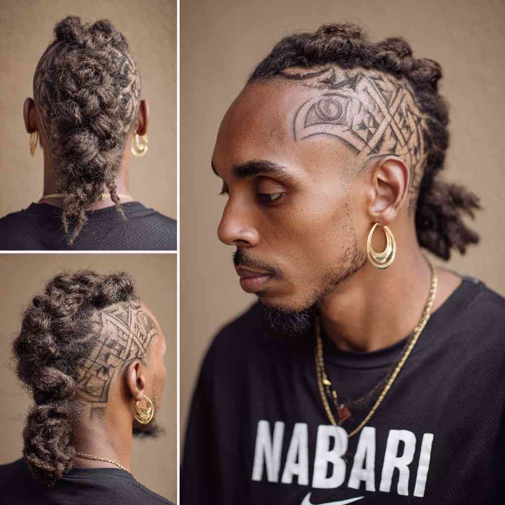 This braided mohawk is paired with shaved tribal-style designs on the sides. The mix of braids and etched shapes makes it a statement look.