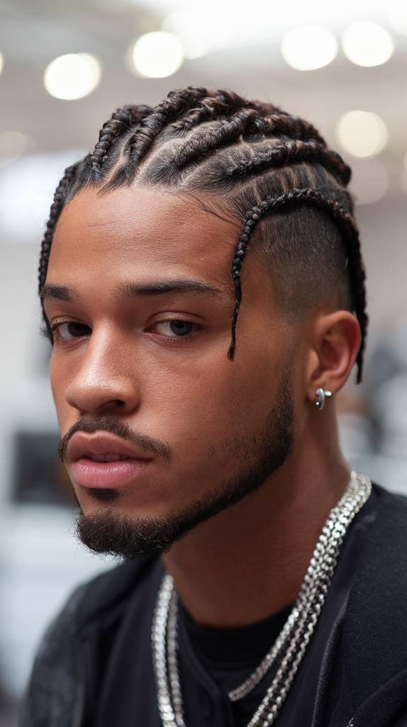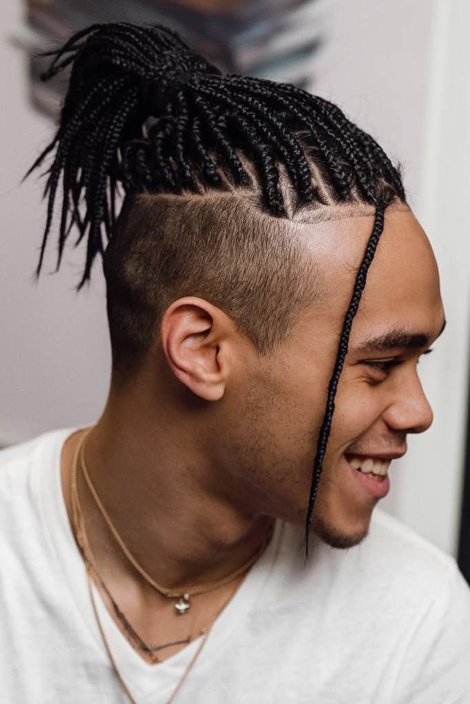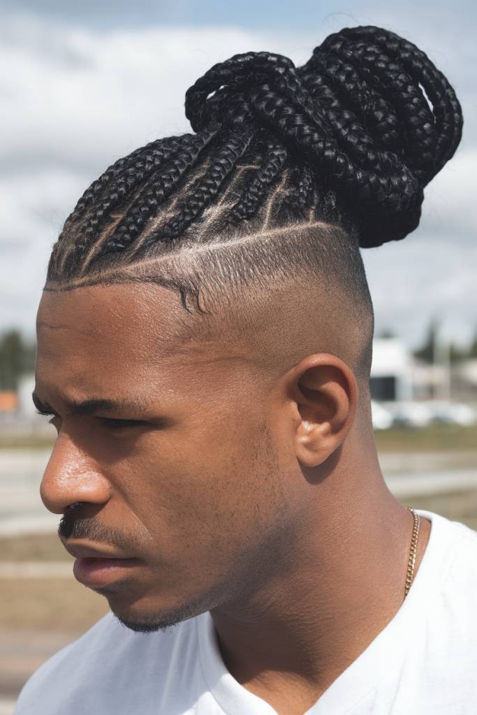 This look mixes tight braids with a modern man bun. The tapered sides keep the haircut clean, while the bun adds style and shape.