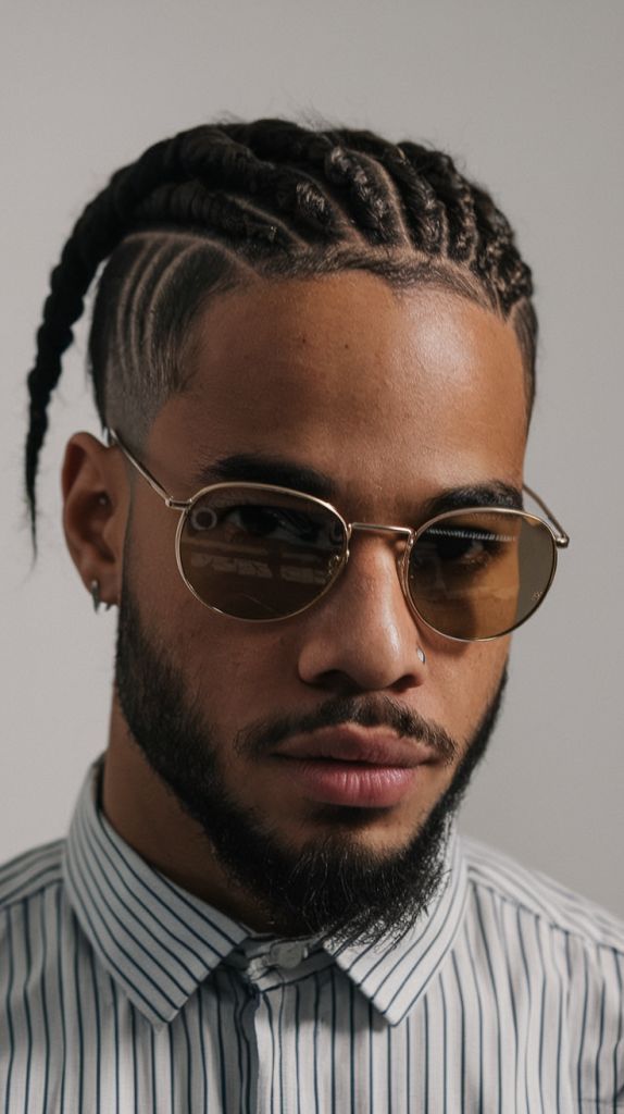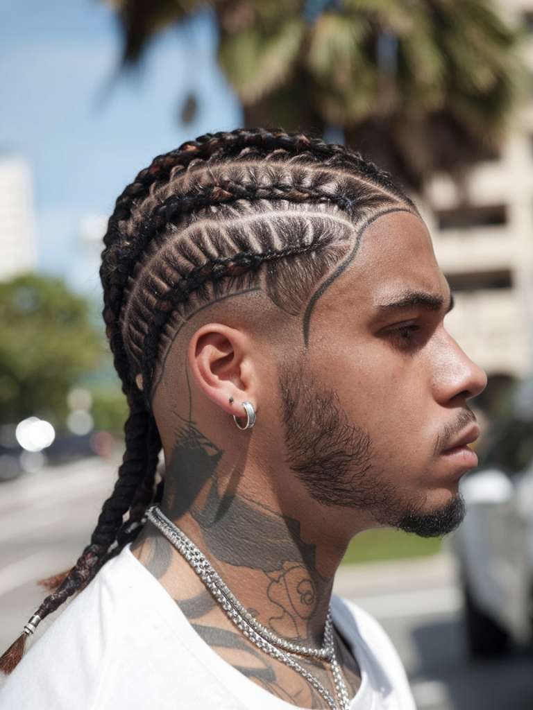 This style brings braids and barber art together. The cornrows stay neat on top, while the faded sides can show cool lines or patterns.