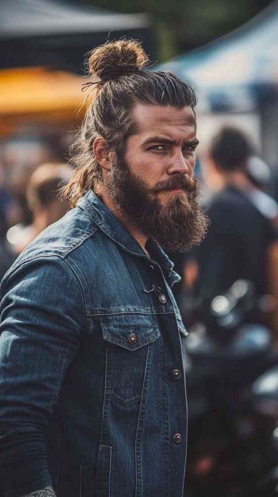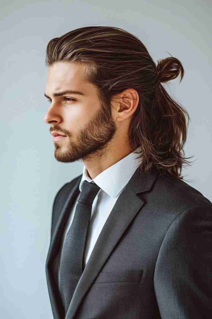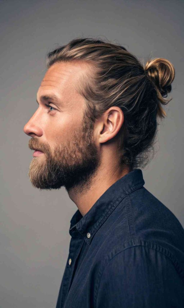 Clean, simple buns usually pair best with a beard because the whole look feels balanced. A slicked back bun or a low bun works well, especially if your beard is shaped and the neckline is kept tidy.