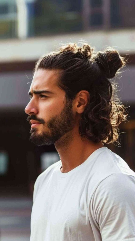 Medium length gives you more options: a classic mid bun, a messy bun, or a slicked back bun for a cleaner look. With long hair, a full bun or low bun feels balanced and easier to secure. Curly hair looks great in a textured bun with a few curls left out. If you wear a beard, keep the bun simple so the look stays sharp. Choose a high bun for sport, or a low bun for calm.