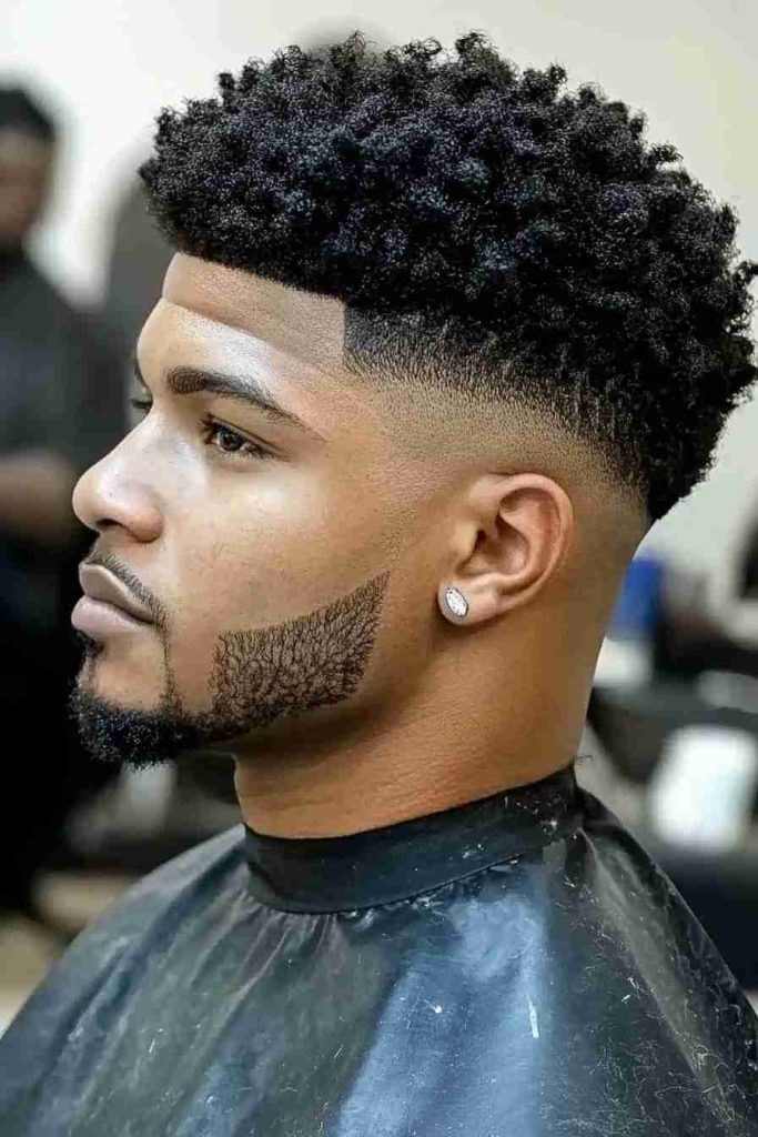 This haircut combines soft curls with a stronger, tighter fade. The curls bring volume and life, and the sides add a neat and structured finish.