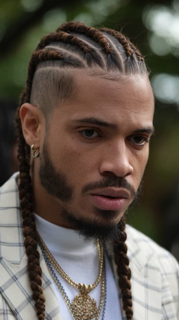 This look uses thick braids and a side taper to create a strong, rugged finish. It has a powerful style that feels bold and different from regular cornrows.