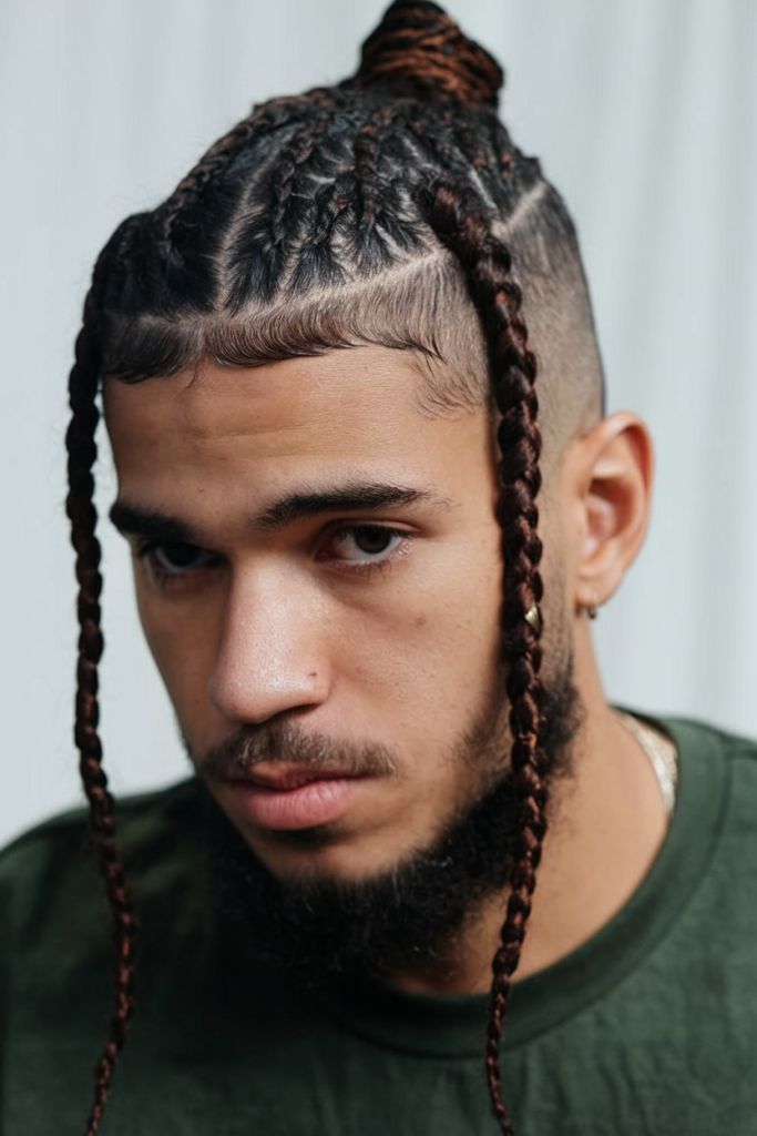 It is a stylish look for men who like small design details in their braids. A satin scarf at night can help hold the ponytail in place and keep the braids from getting fuzzy.