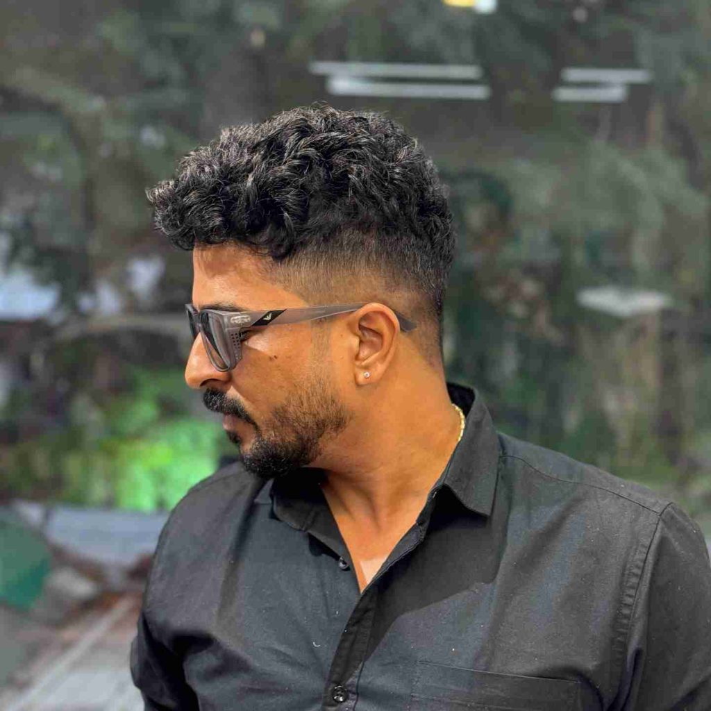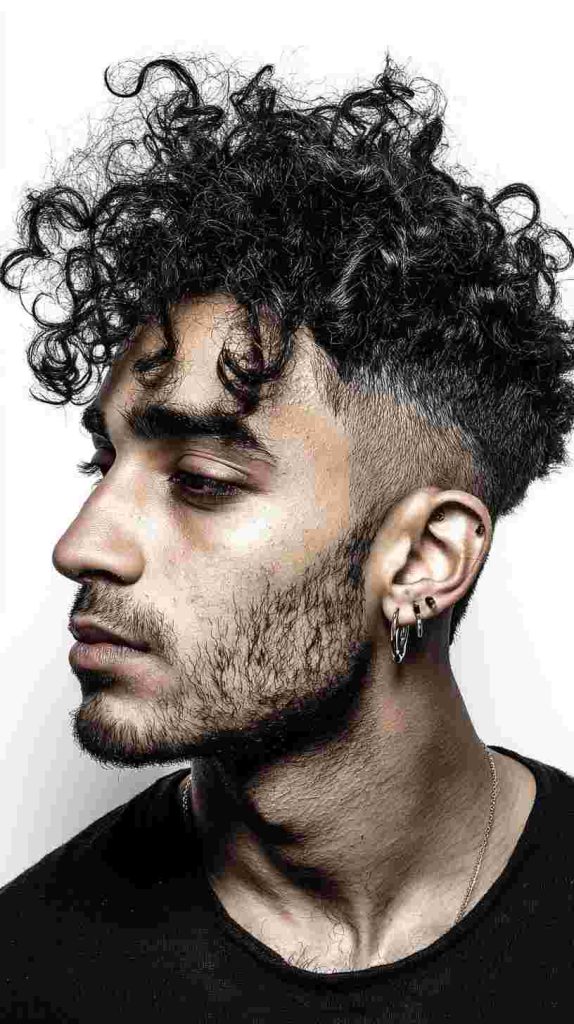 The curly high fade gives a bold and sharp look. The sides are cut very short, while the curls on top stay lifted and defined. This creates a strong contrast that looks modern and confident.