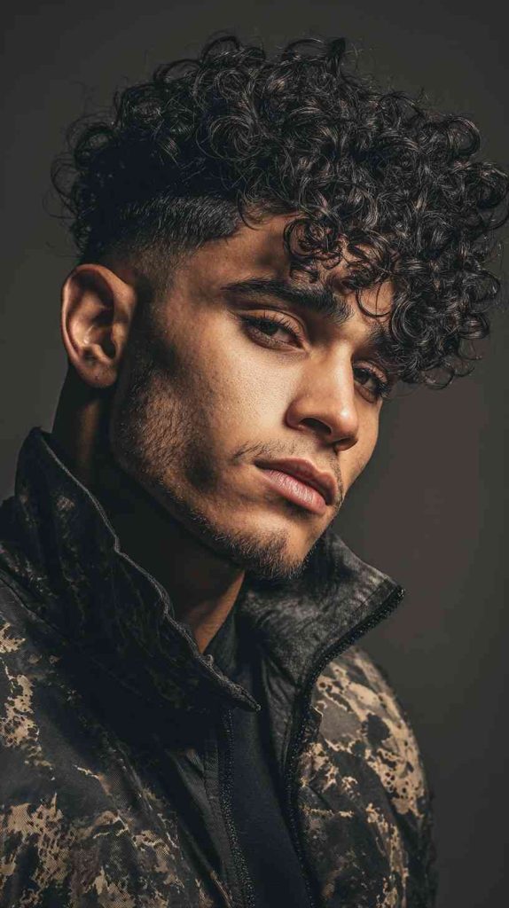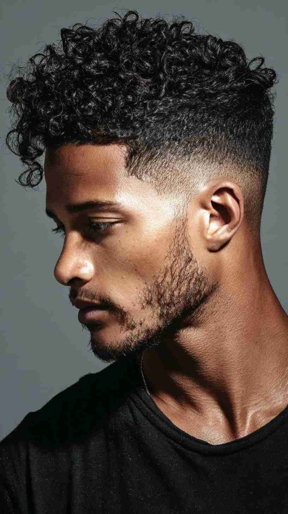 This style is perfect for men who want more height and less width. The high fade keeps the haircut fresh and clean, and the top remains full of texture. A curl cream with soft hold can keep the curls in place without making them stiff.