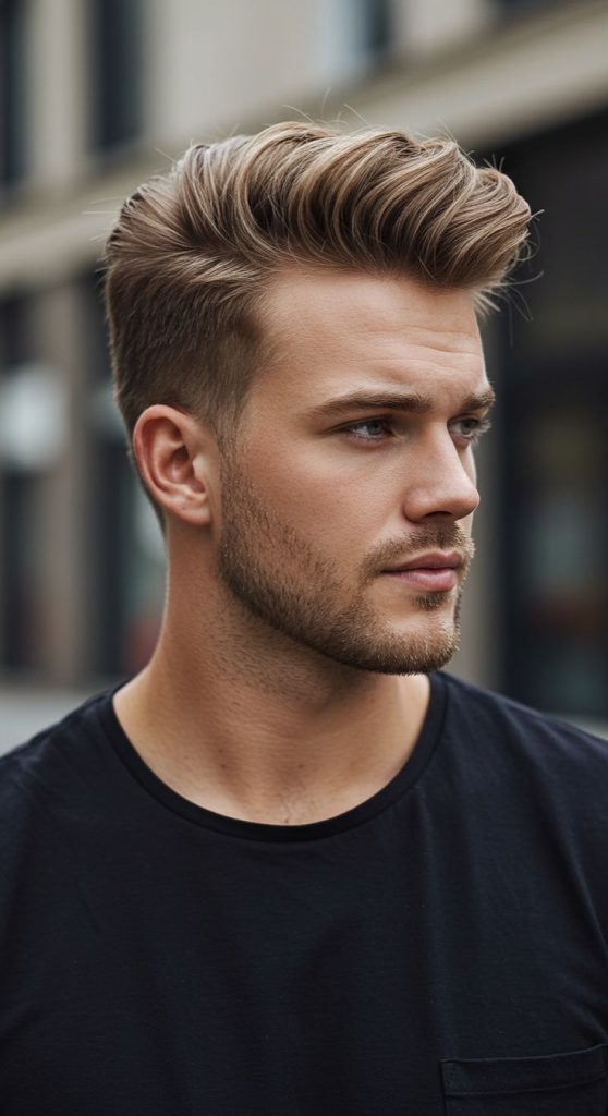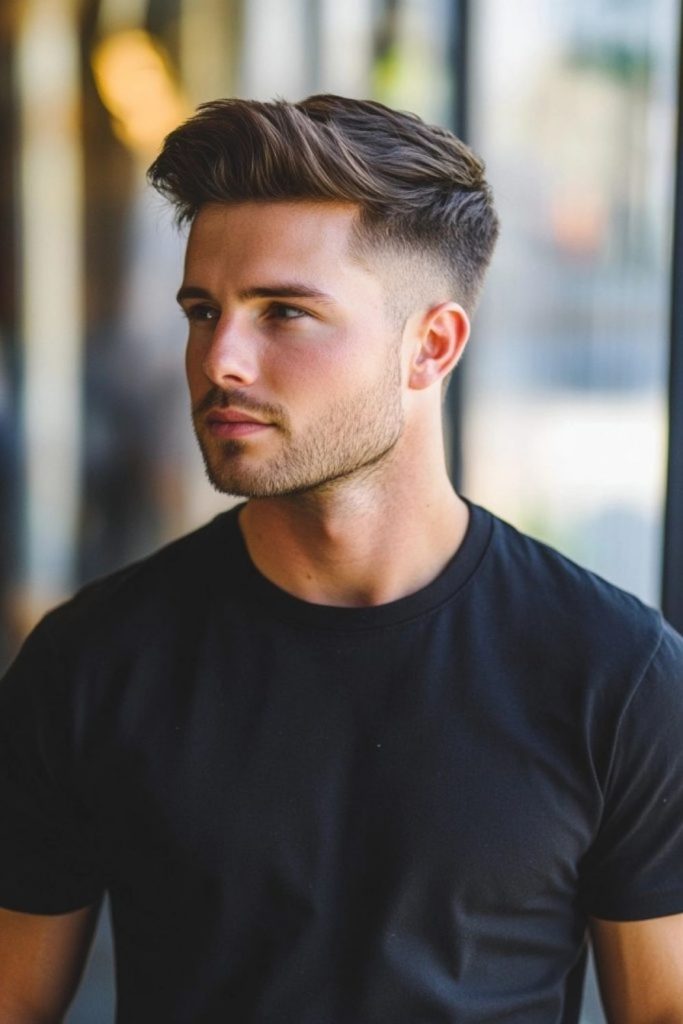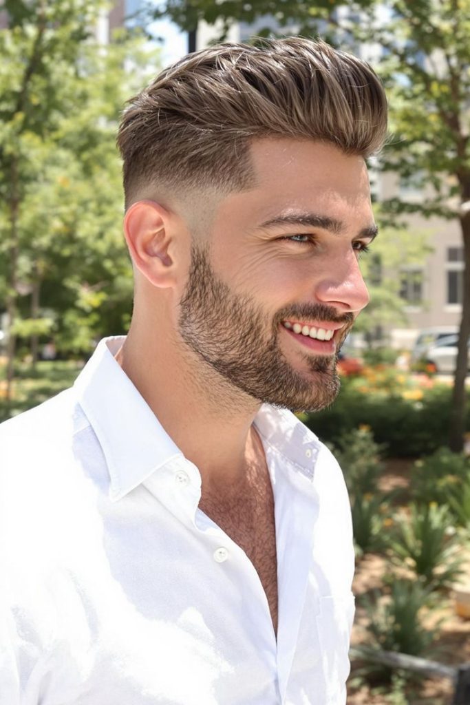 A pompadour fade has volume on top and faded sides. The top is brushed up and back, which creates a fuller and more stylish shape. It gives a bold and confident look.
