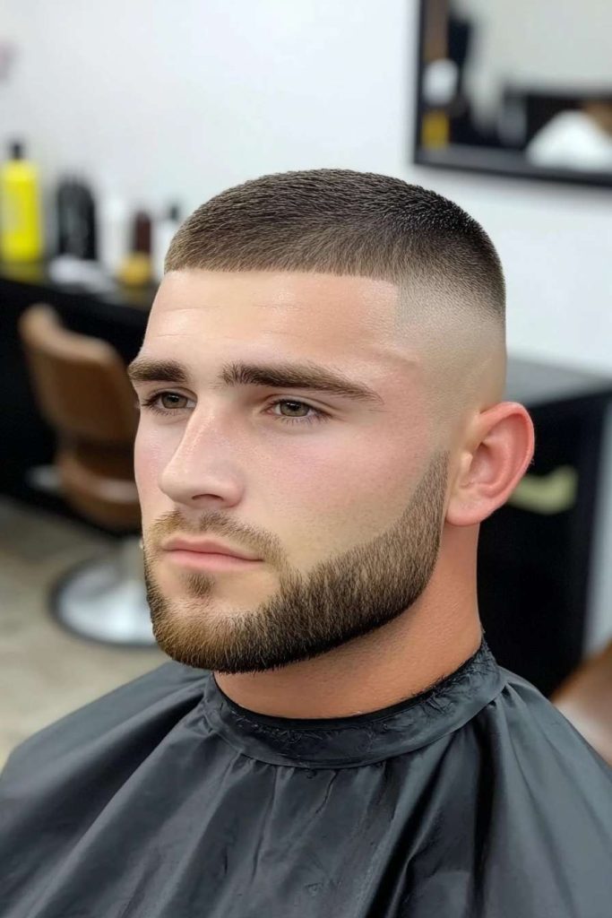 This haircut is simple, clean, and very easy to maintain. The buzzed top keeps everything low effort, while the skin fade adds a crisp and modern finish. It is perfect for men who like simple style.