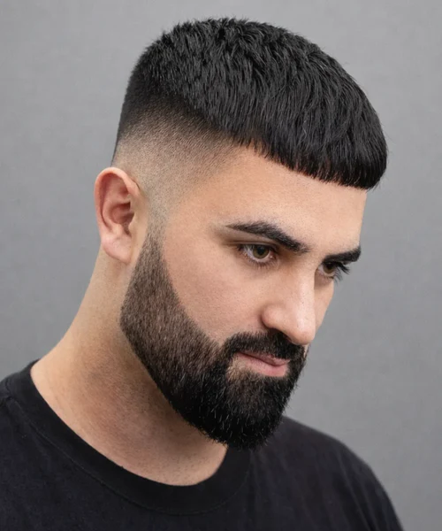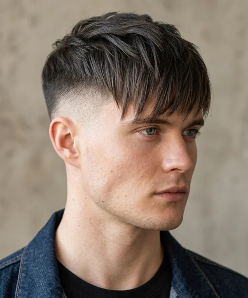 This style works well for men with straight and dense hair. The top is left longer, and the front can fall forward like a fringe. The smooth texture of straight thick hair makes this cut look bold and noticeable.