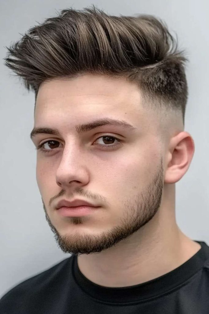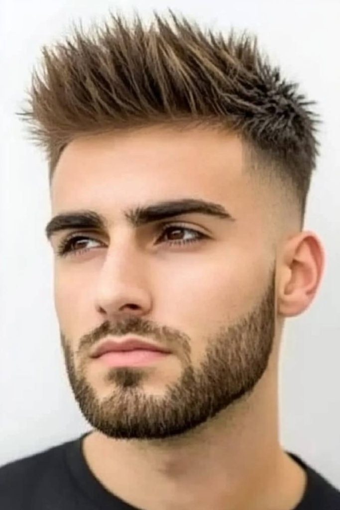 Spiky texture on top adds edge and energy to your look. The fade keeps the sides tight so the style doesn’t feel too wide.