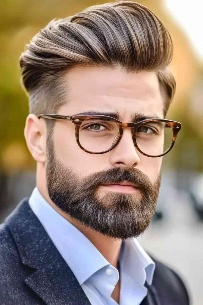 3. Side Swept Pompadour + Full Beard