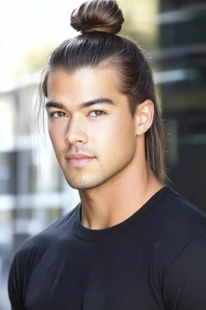A high man bun pulls the hair up and keeps your face open and clean. Because oval faces are already balanced, this style doesn’t throw your proportions off.