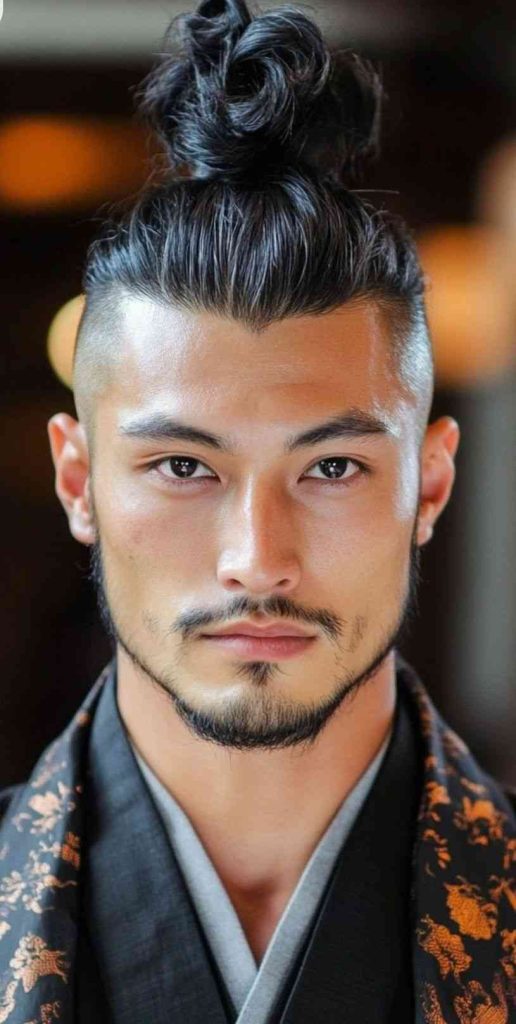 This is one of the sleek Man Bun Hairstyle Ideas with short faded sides and a tight bun on top. The clean lines make it look sharp and modern. It’s great for guys who like neat and polished styles. In photos, the fade looks smooth, and the dark background keeps the focus on the tidy shape of the hair.