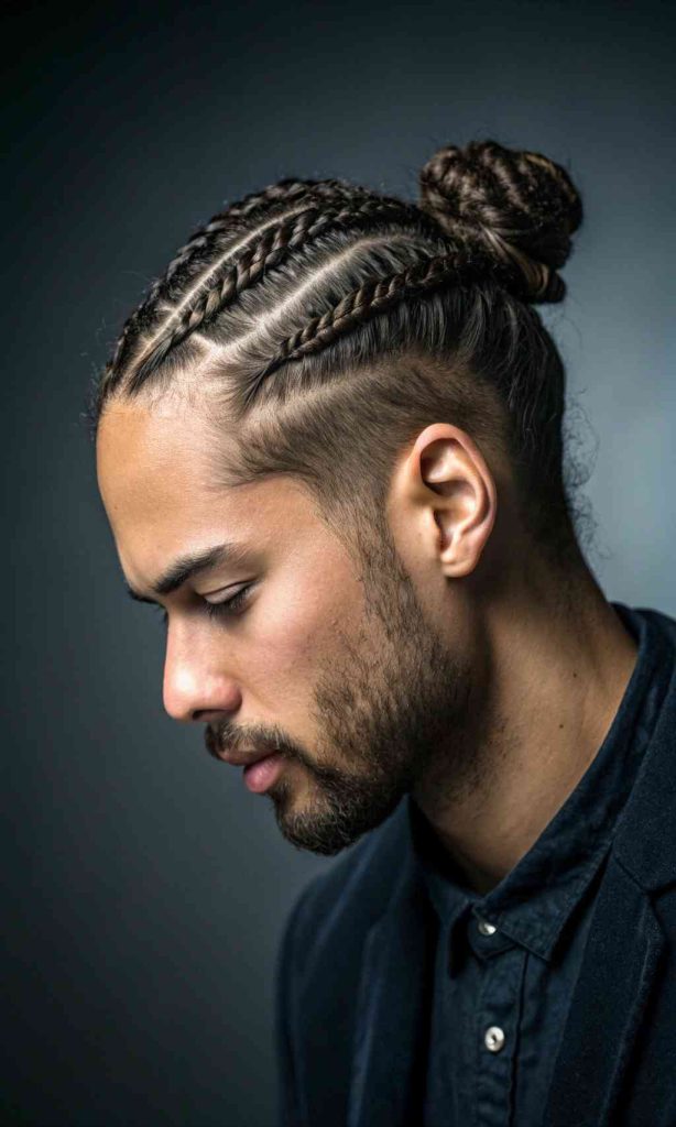 Braids leading into a bun make this one of the most creative Man Bun Hairstyle Ideas. It feels fresh, stylish, and full of personality. The small braid details add pattern and shape, making the hairstyle come alive. In pictures, soft background tones let the braid lines stand out clearly, giving a calm and cool effect.