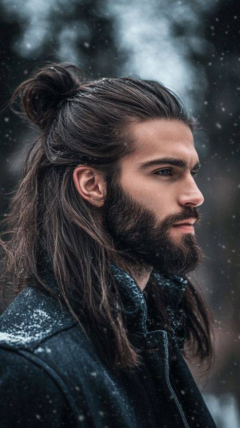 Men with long hair can tie it up in a bun to keep it tidy but still show its length. This is one of the classic Man Bun Hairstyle Ideas that gives a smooth and relaxed look. It’s simple, natural, and easy to manage. In portraits, the bun looks calm and neat against a dark background, sharing a peaceful and mature feeling.