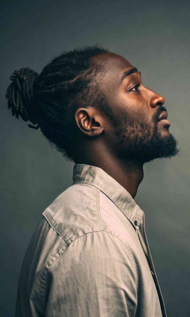 This style celebrates natural hair texture and strength, making it one of the most powerful Man Bun Hairstyle Ideas. Tied coils or locs form a bun that looks stylish and proud. It shows beauty in every twist. In a photo, the soft light brings out the rich texture, showing confidence and grace in every detail.