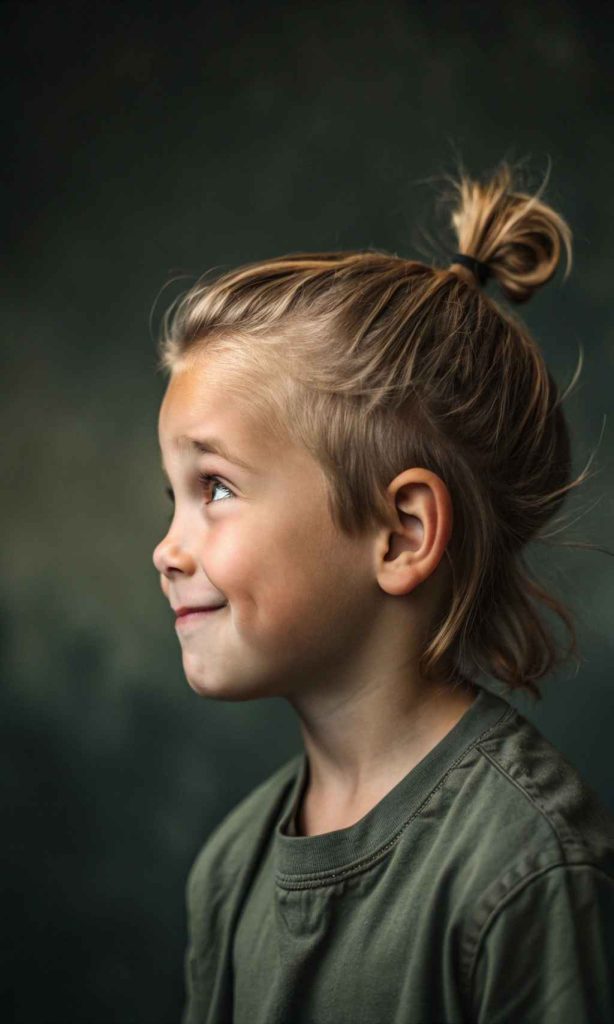 A small bun on a young boy looks cheerful and cute. This is one of the simplest Man Bun Hairstyle Ideas that keeps hair neat while letting kids play freely. It adds style without too much effort. Pictures of this style with soft lighting and a calm background look sweet and happy, showing a joyful energy.