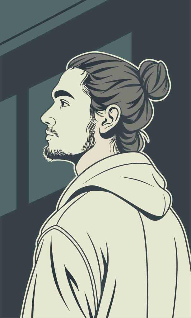 This version is made for study and learning. As one of the practical Man Bun Hairstyle Ideas, it shows the shape of the bun clearly with good lighting and simple lines. It helps artists see how hair twists and folds. The dark background and soft light keep the focus on the hairstyle’s form and structure.