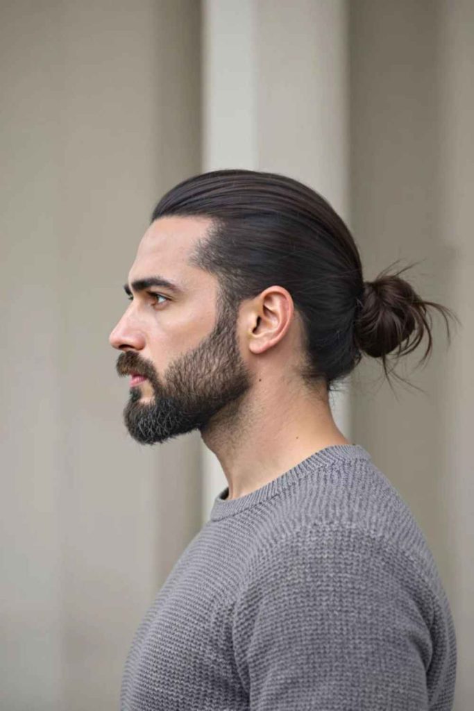 This look feels calm, tidy, and respectful. It’s one of the smoothest Man Bun Hairstyle Ideas, often tied neatly in a simple way that shows balance and discipline. In photos, the bun looks graceful against a quiet dark background, giving off a peaceful and confident energy that never goes out of style.
