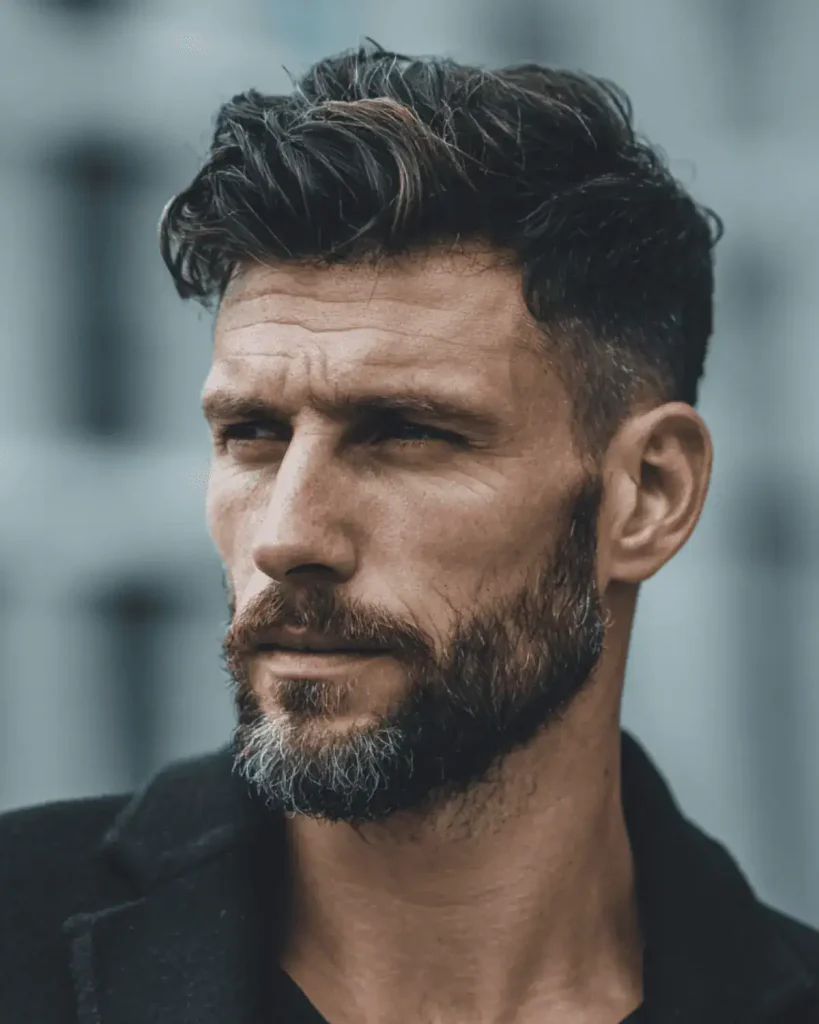 A medium beard fade blends from shorter hair near the ears into more length around the jaw and chin. It looks sharp but still keeps that masculine, rugged feel.
