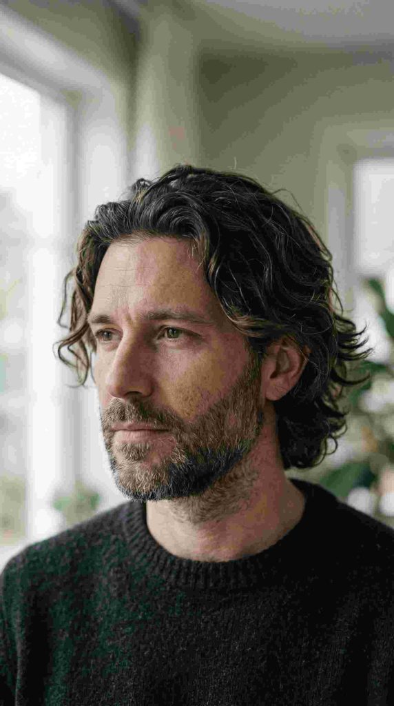 Curly hair really shines with Medium Length haircuts for men since the curls get shape and bounce. The key is keeping the sides neat so the curls on top don’t look too wide.