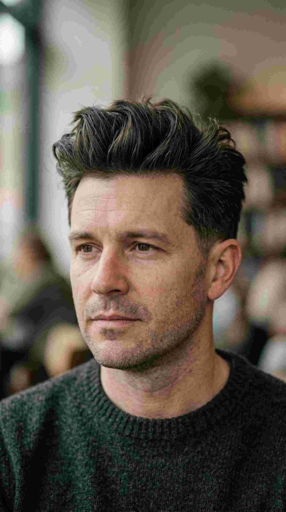 This cut works well for work and weekends because it can be slicked back or worn messy. A small amount of matte paste gives control without making it look stiff.