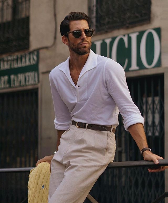 A white linen shirt instantly upgrades Men’s Summer Fashion because it looks sharp but still breathes well. Pair it with tailored beige trousers for an outfit that works for lunch meetings, city exploring, or a nice dinner.
