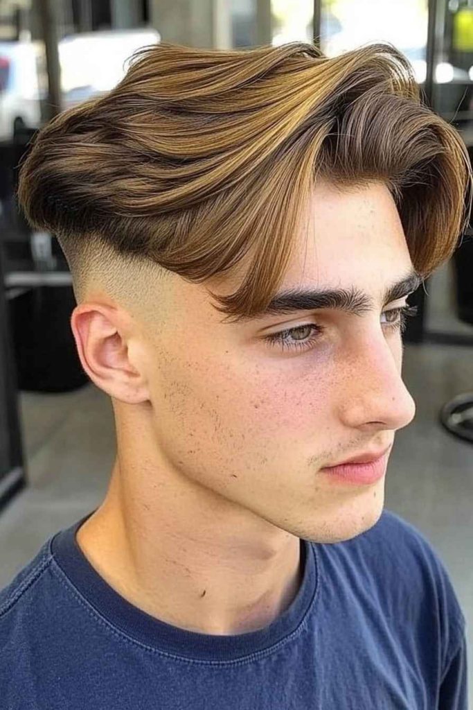 This style keeps the top long and separates it clearly from the shaved sides. The middle part stays visible, and the top can sweep out wide for drama.