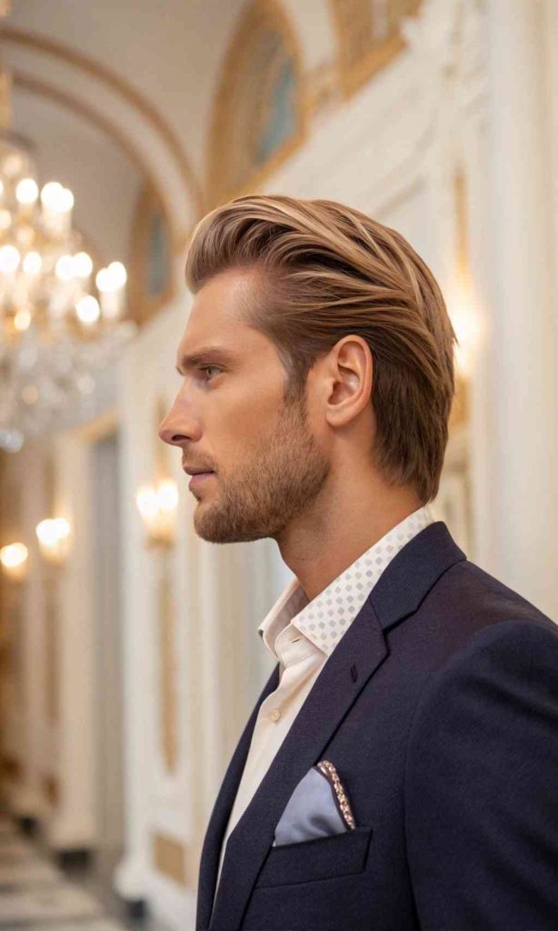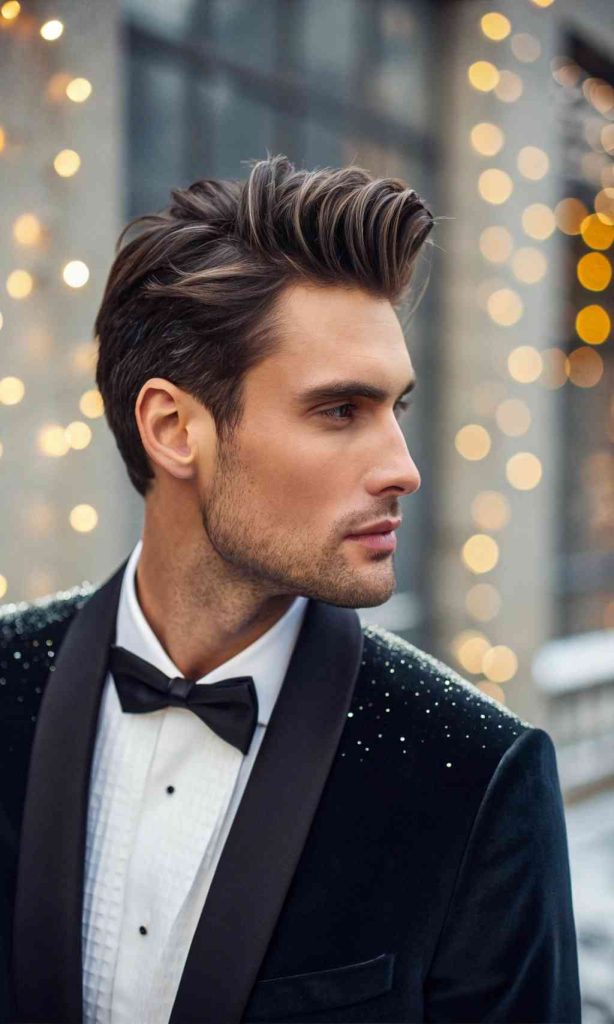 For black‑tie dinners or classy events, New Year’s Hairstyles Men become more refined and smooth. A clean part, slick finish, or neatly groomed pompadour gives instant sophistication. The emphasis is on polished lines and a tidy silhouette that complements formal wear. With a bit of gel or pomade, everything looks intentional and timeless.