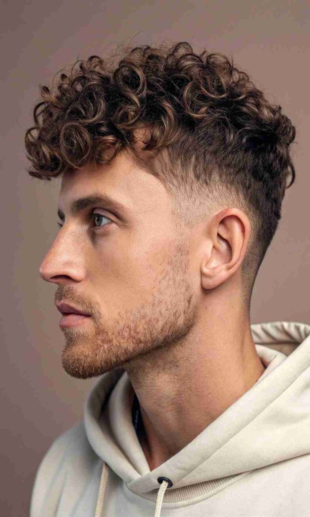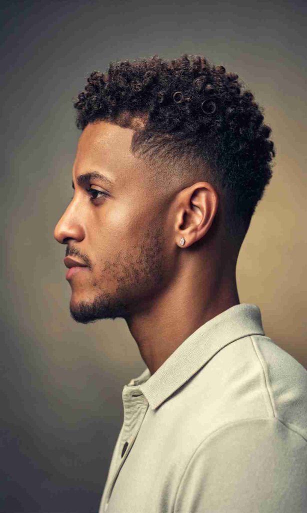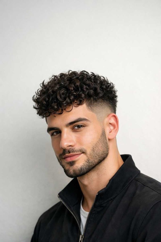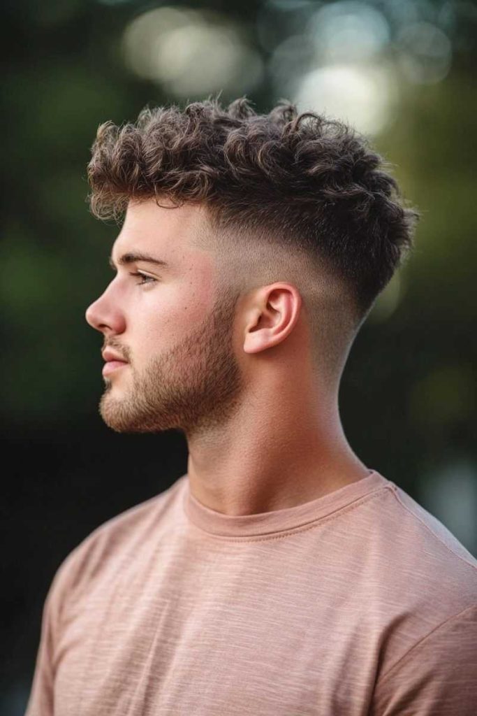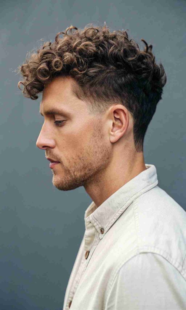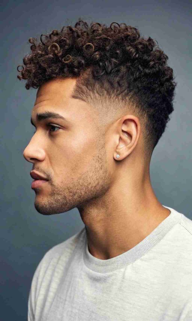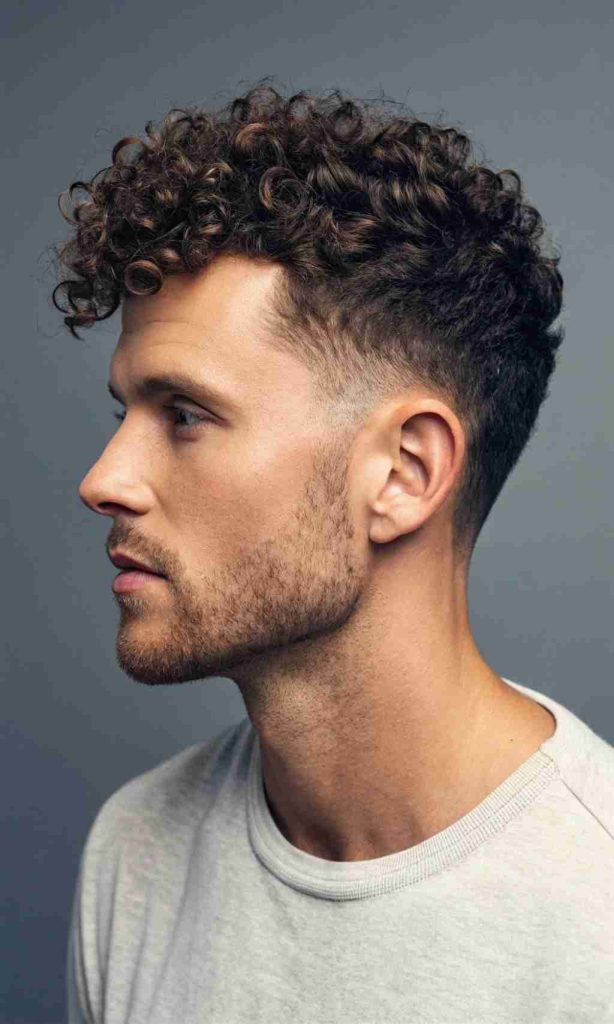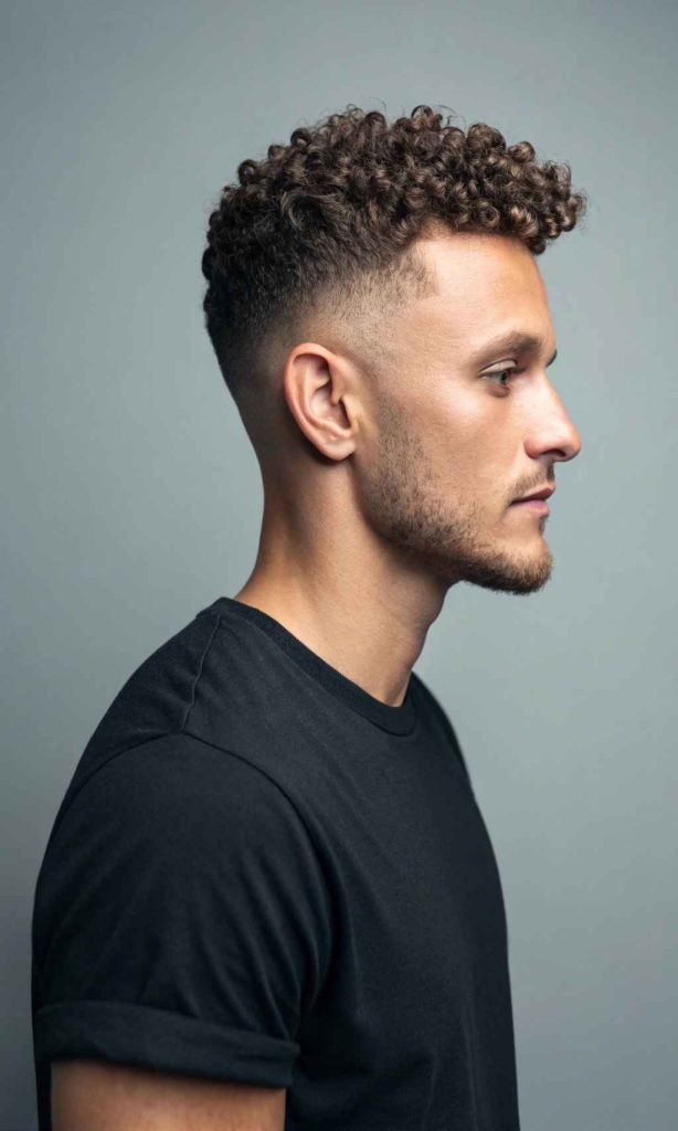 This cut keeps your curls on top and brings in a smooth fade on the sides, so the whole look feels sharp. Short Curly Haircuts for Men like this stand out in a good way because the fade makes the curls look even more defined.
