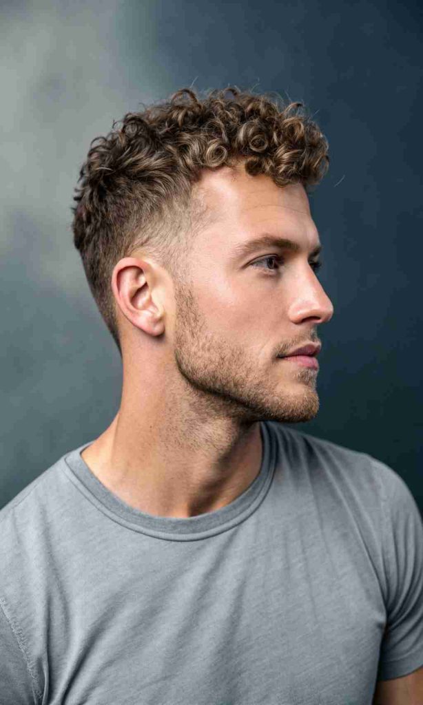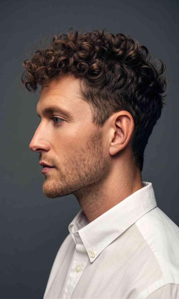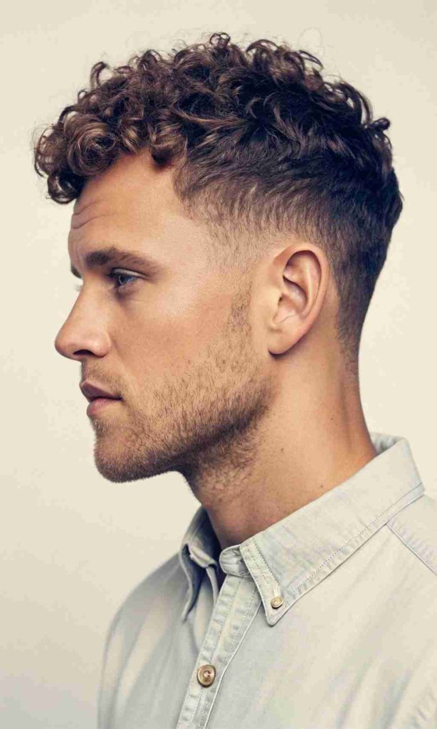 A taper fade keeps things neat around the sideburns and neck, but it doesn’t go super short on the sides. Short Curly Haircuts for Men with a taper feel polished without looking too strict.