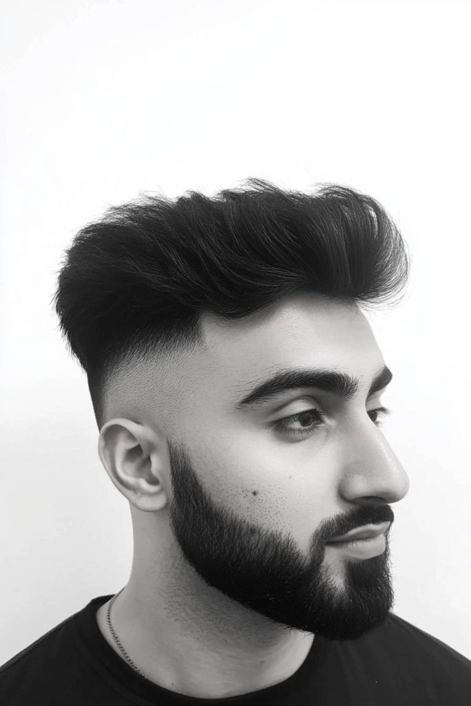 This haircut brings a classic pompadour shape into a fresh, short style. The fade on the sides keeps the look clean and balanced.