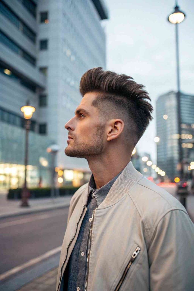 Short pompadour is good choice for men who like stylish haircut but still want short sides. It can be mixed with fade or taper for extra clean style.