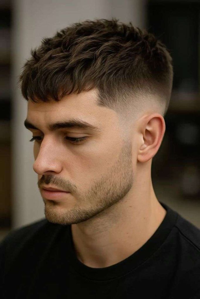 Textured crop is a messy short hair mens haircut. The top has layers and choppy texture, while sides are faded. It look edgy and modern.