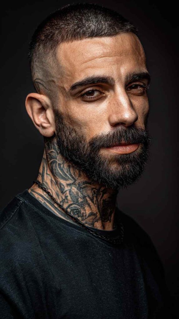 The skin-fade buzz combines a short buzz on top with a fade that goes very close to the skin on the sides. This creates a sharp and modern contrast. It looks bold and very clean.