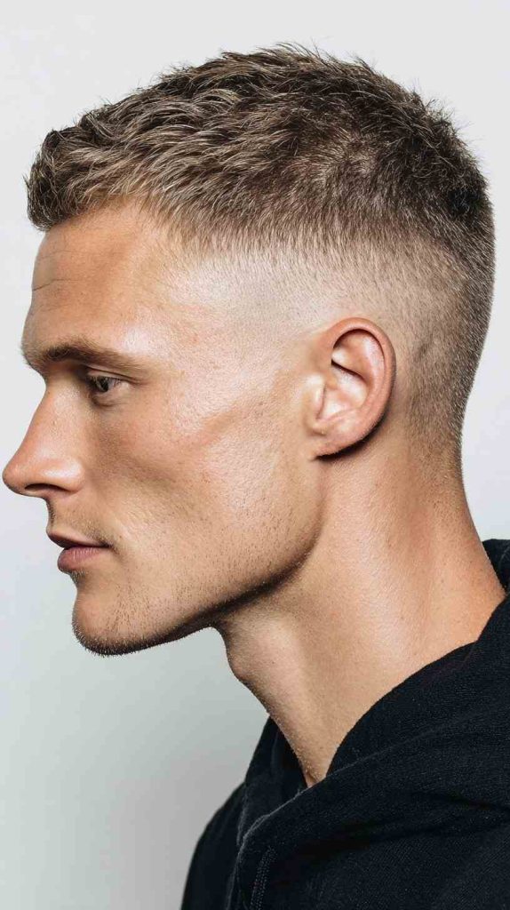 This style suits men who like strong and defined haircuts. It needs regular barber visits to keep the fade looking smooth. If you want edgy Short Haircuts Ideas for Men, this haircut is a strong option.