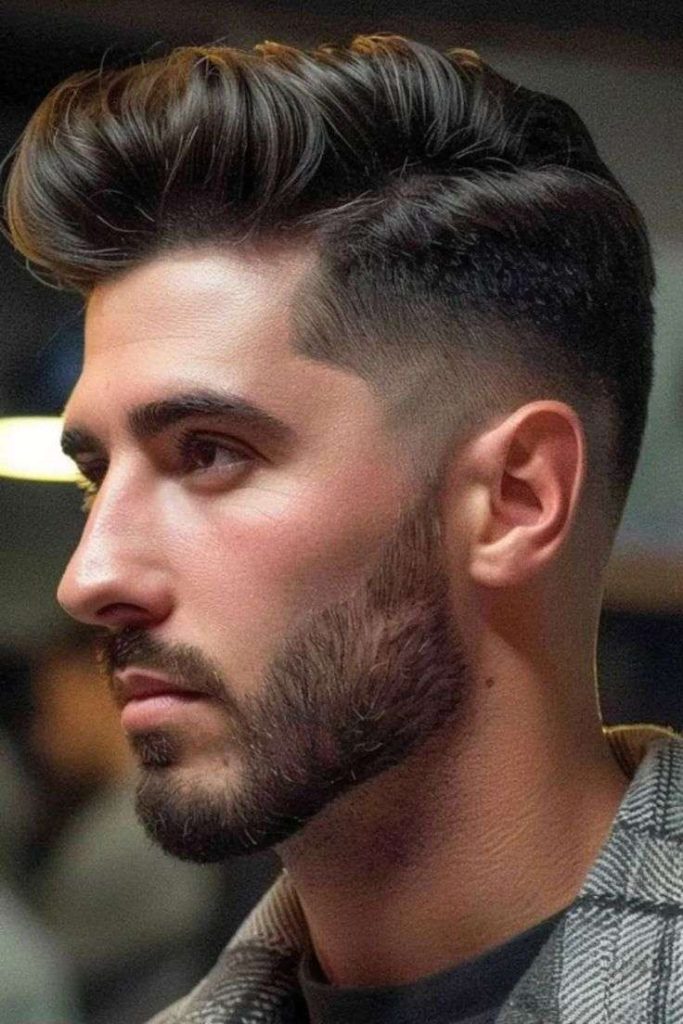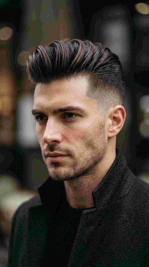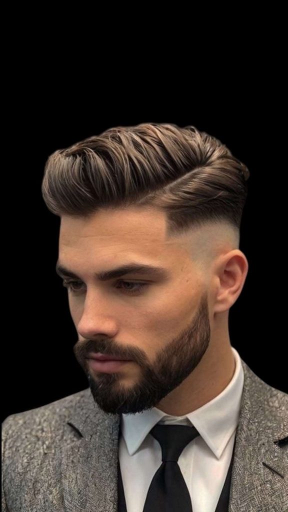 The side part short pompadour mixes the lift of a pompadour with a neat side part. This creates a smart and structured shape that looks very polished.