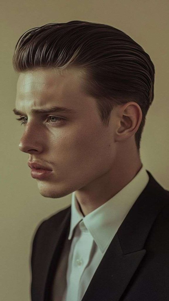 The slicked back short pompadour has a smooth top that is pushed back neatly. It often uses pomade or gel to create shine and hold.
