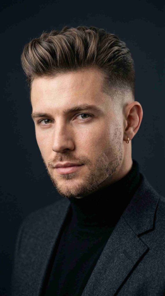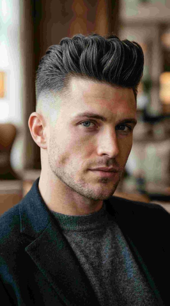 A textured short pompadour adds movement and a slightly messy feel to the top. Instead of looking too smooth, the hair has small layers that create a fuller and more natural style.