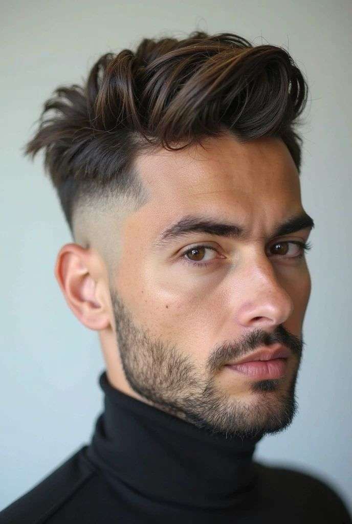 The high fade short pompadour places the fade much higher on the sides. This gives the haircut a stronger contrast and puts full attention on the lifted front.