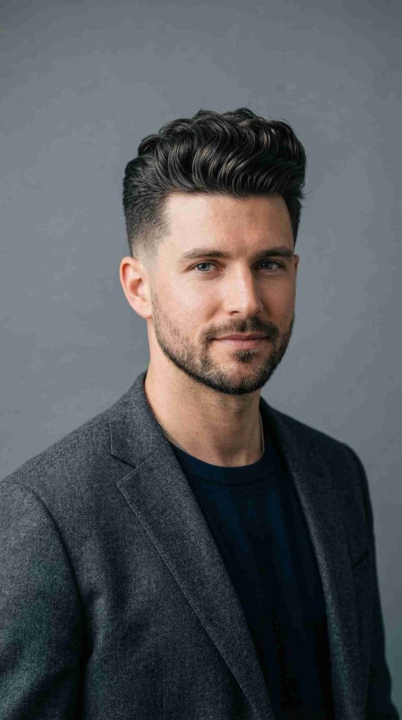 The short wavy quiff lifts the hair at the front and keeps the rest neat. It adds height and makes the haircut look clean and confident.