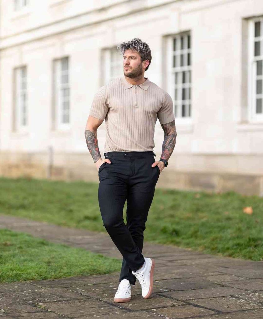 A neutral ribbed polo with black trousers and white sneakers is an easy win for casual Fridays. It gives you comfort, but the clean fit keeps it in smart casual men summer territory.