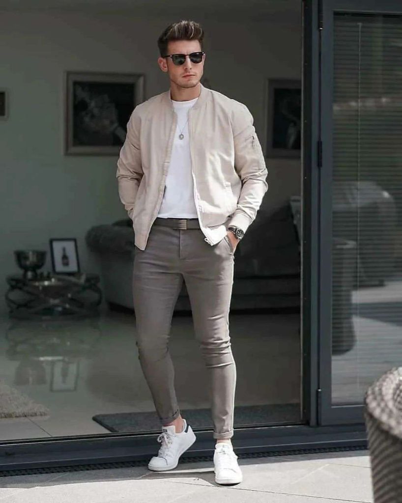 A light beige bomber jacket over a white t-shirt with grey trousers gives a modern city look. It’s ideal for summer evenings when the weather cools down, or for offices that allow light outerwear.